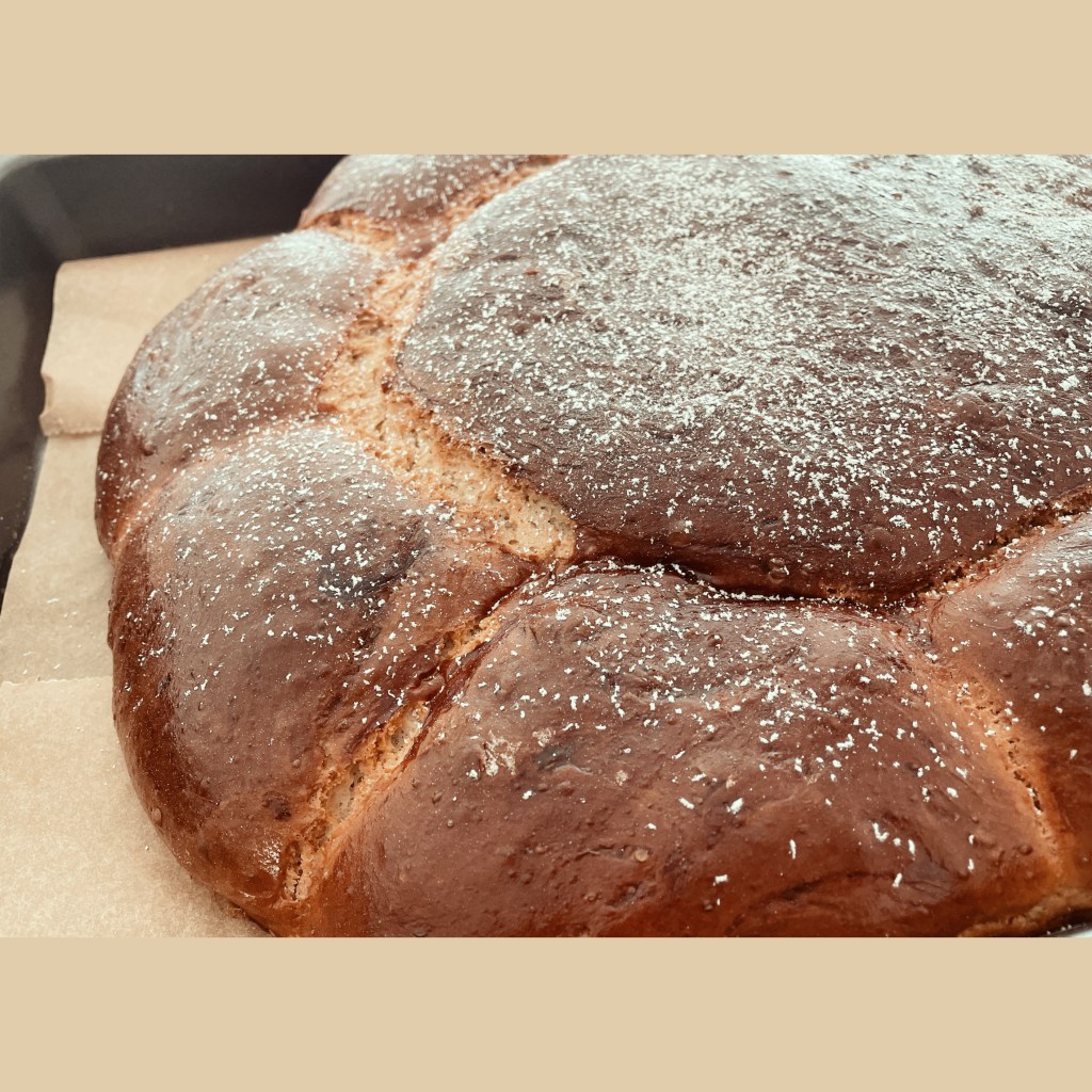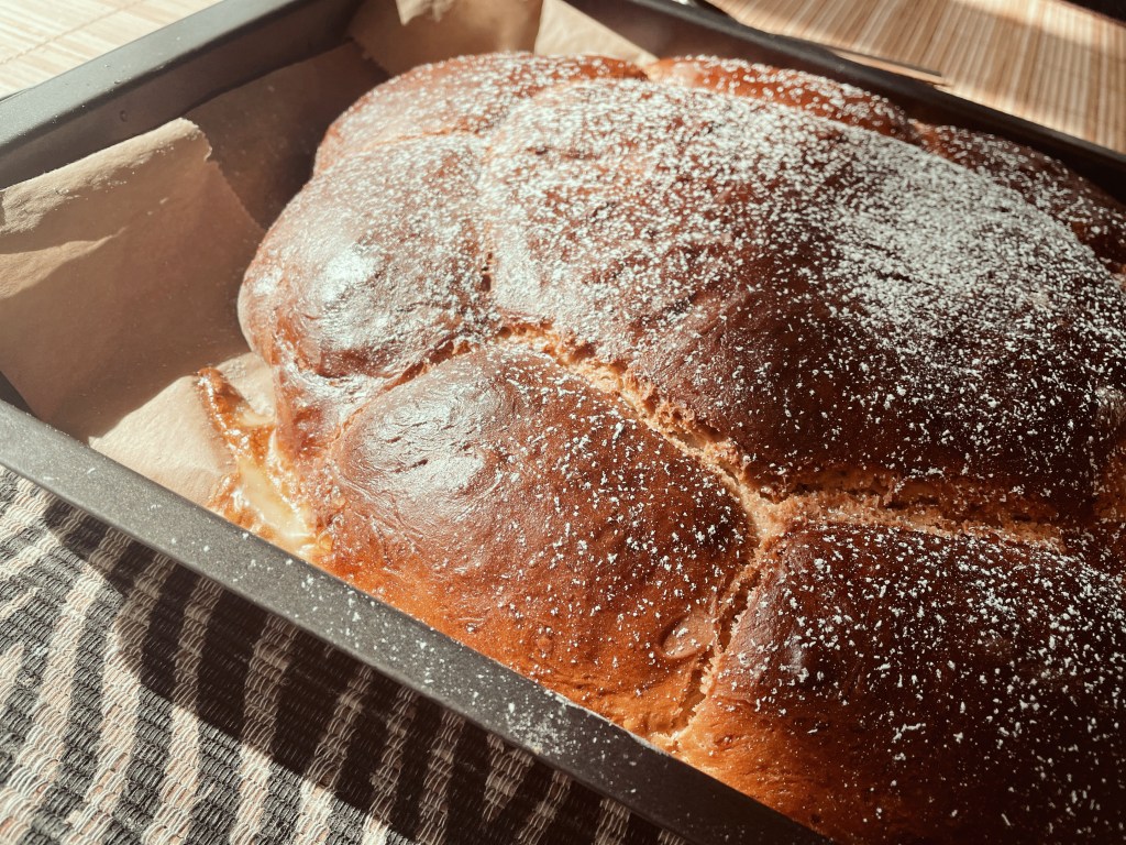Milch und Eigelb in einer Schüssel verquirlen, darüberpinseln und im vorgeheizten Ofen bei 180 Grad die Buchtelblume ca. 30-35 min backen.
