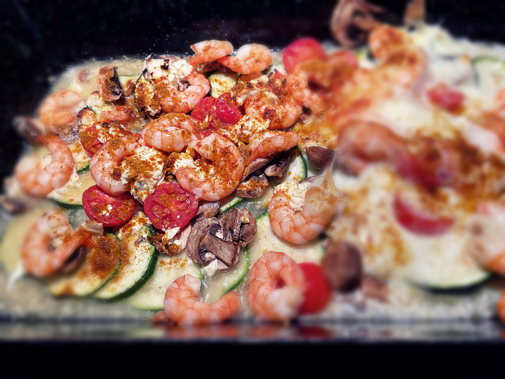 Eine Auflaufform vorbereiten. Zucchini schlichten. Gemüse darauf verteilen. Garnelen darüber und Schafkäse darauf „zerbröseln“.