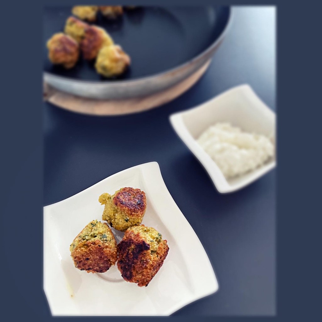 Aus der Masse kleine Bällchen formen und auf ein Backpapier legen. Die Fallafeln mit etwas Olivenöl einpinseln und im vorgeheizten Backrohr bei 220 Grad Heissluft schön braun und knusprig backen. (Es geht natürlich auch diese Bällchen in Kokosöl in der Pfanne zu braten)