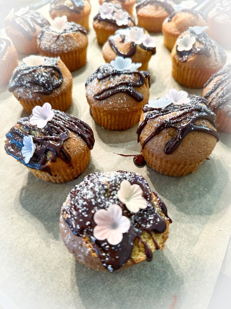 Die zerronnene Schokolade über die Muffins träufeln lassen. Staubzucker oben drauf und die Blumen dazu. Fertig.