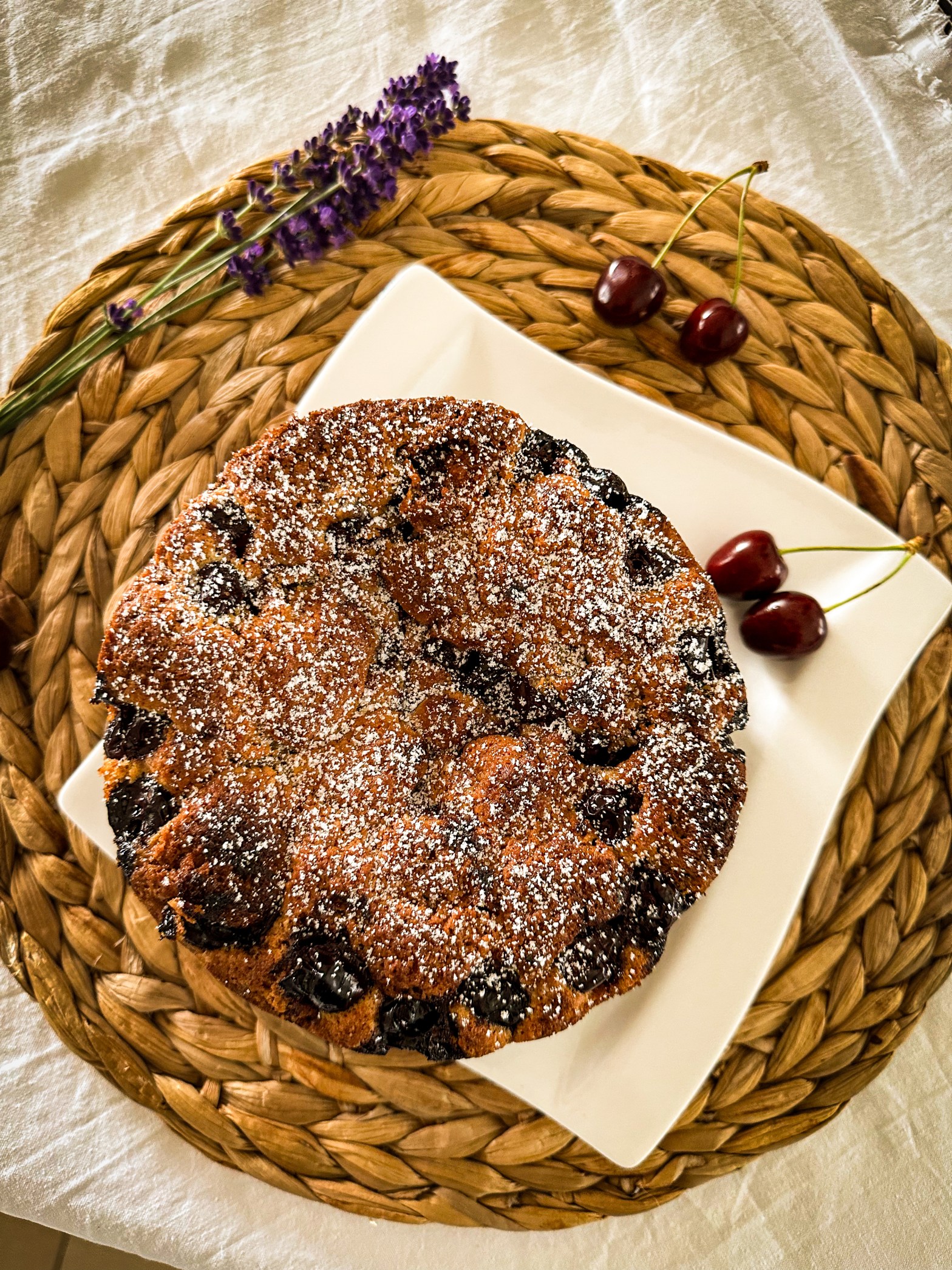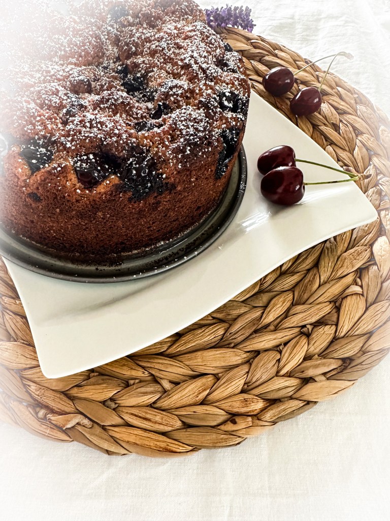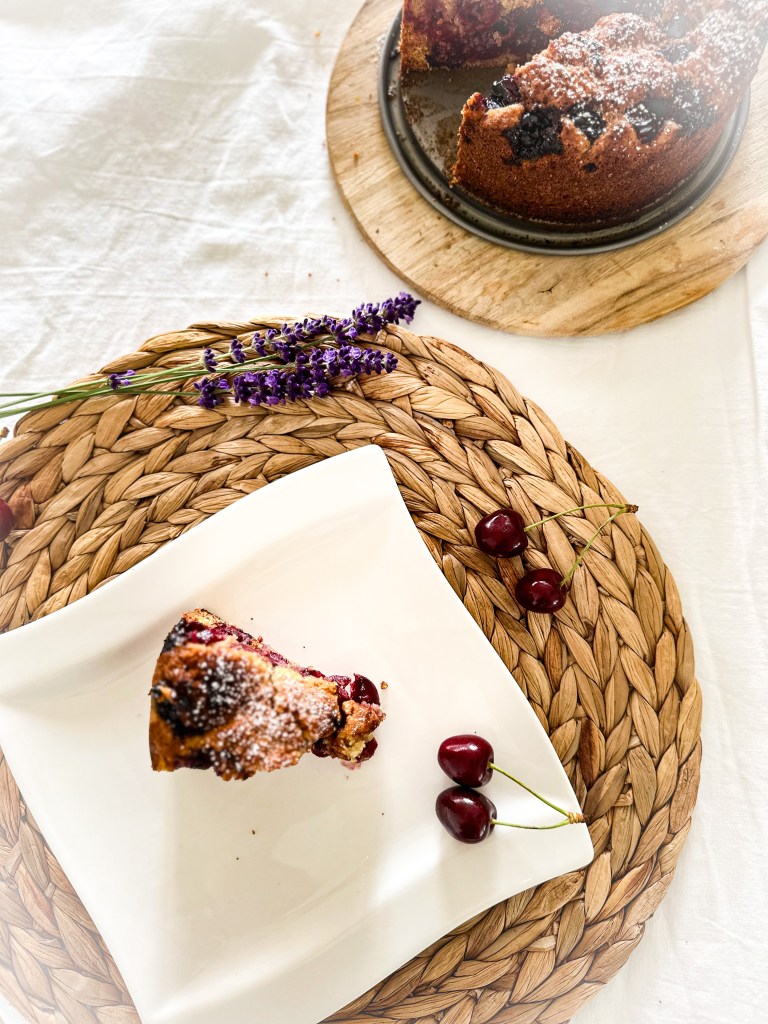 Dann nichts wie los, Mehl, Eier, Zucker und in diesem Fall Kirschen schnappen und ab in die Küche.