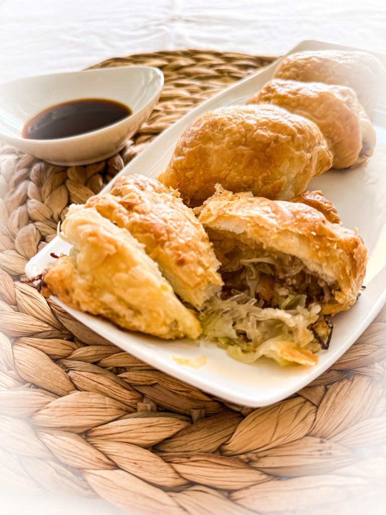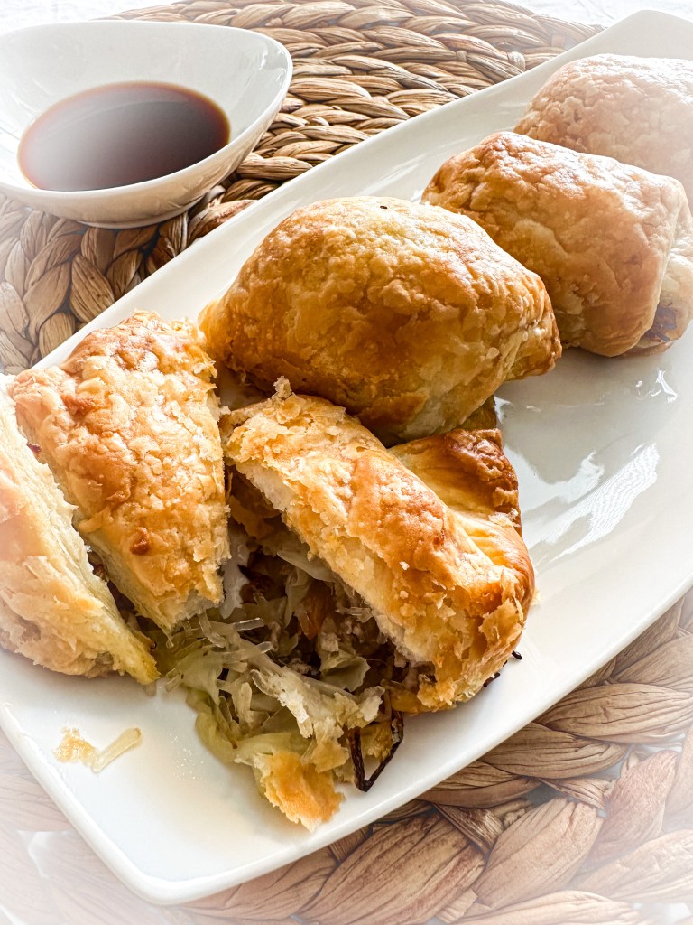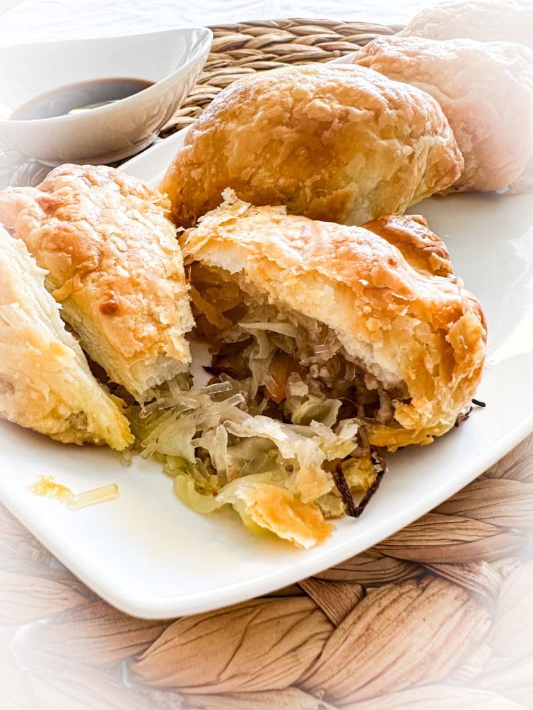 1-2 Pkg. Dinkel Blätterteig, Weisskraut, Mungobohnen Keimlinge, Sojasauce, Zwiebel, Karotten, Hackfleisch, Suppengewürz, Glasnudeln