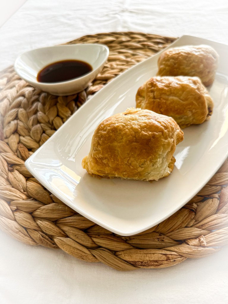 Blätterteige in Quadrate schneiden. Die Füllung auf die untere Spitze geben und aufrollen, dann die beiden Seiten einklappen und weiter bis nach oben rollen.