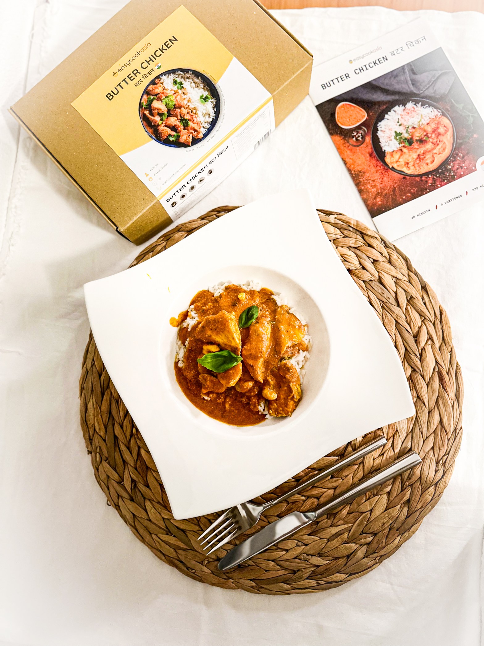 Es sind saftige Stücke Hühnchen ummantelt von einem Mix aus Jogurt, Koriander und Chili Pulver für den extra Kick. Es wird in einer aromatischen, sämig-dicken Sauce aus Tomaten, Zwiebeln und einer Gewürzmischung gekocht. Die Sauce wird püriert und mit Butter und Creme Fresh angereichert, so dass sie ihr cremig-buttriges Aroma erhält. Als i-Tüpfelchen wird es noch mit einer kleinen Menge von Bockshornklee bestreut.
