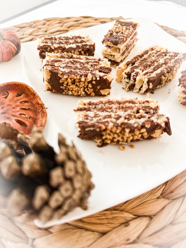 Waffelplatte damit bestreichen und in einzelne Stücke schneiden, danach übereinanderlegen und mit Krokant bestreuen.