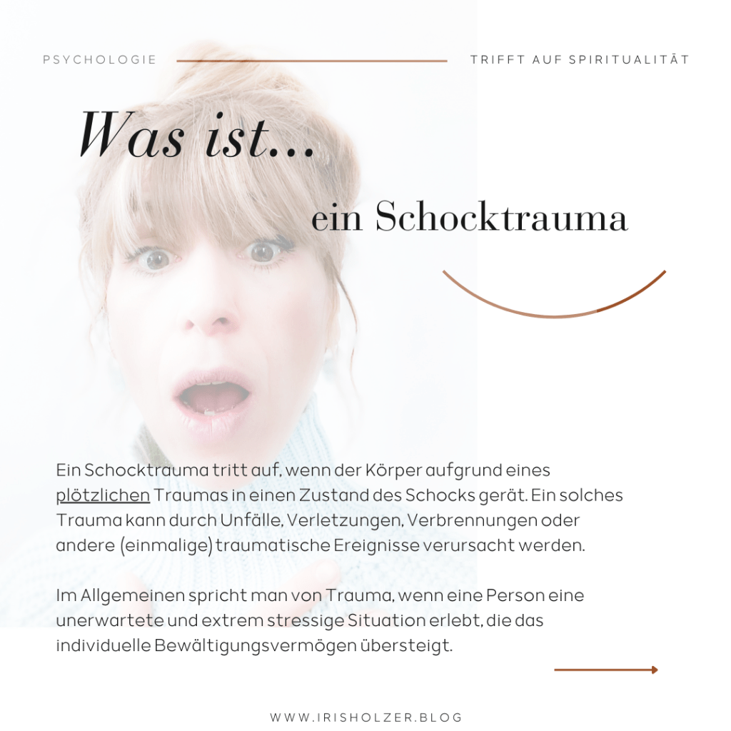 Schocktrauma kennzeichnet sich dadurch, dass ein Ereignis/eine Situation, eine gewisse Zeitdauer begrenzt ist. Es gibt einen Beginn und kurz darauf ein Ende. Es tritt oft einmalig auf.